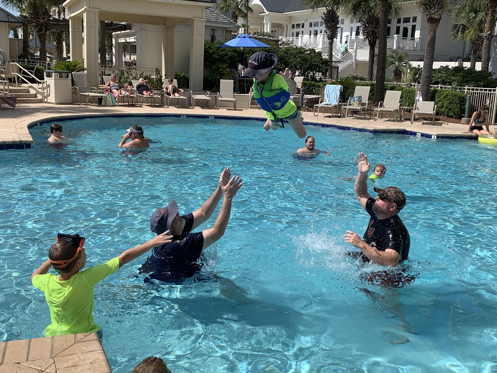 Then we ate some lunch and headed to the pool. Our boys are pretty lucky to have so many adults that love them on this trip- more jackpot, throwing the football, and then even throwing them took place!
